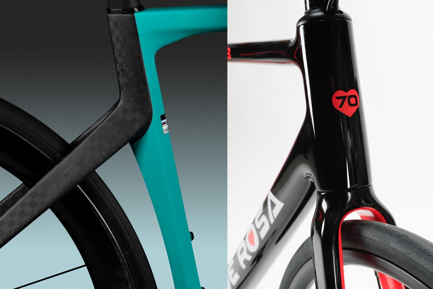 SETTANTAは、DE ROSAがスポンサーするUCIプロチーム VF Group Bardiani- CSF Faizanèのメインマシンとして、6月1日まで開催中のジロ・デ・イタリアで戦っているレーシングモデルながら、一般ライダーにも乗りやすい万能高性能モデル。2025モデルではフレームセットの販売もあり、ディスクロードからのお乗り替えであれば、コンポーネントやホイールを流用することでご予算を抑えてオーナーとなっていただけます。カラーは全12色から選択が可能。SETTANTAの展示&試乗車には、Eclipse Team、Eclipse Red、Eclipse Nobileの3カラー、サイズは44.5、46.5、48の3タイプをご用意しました。