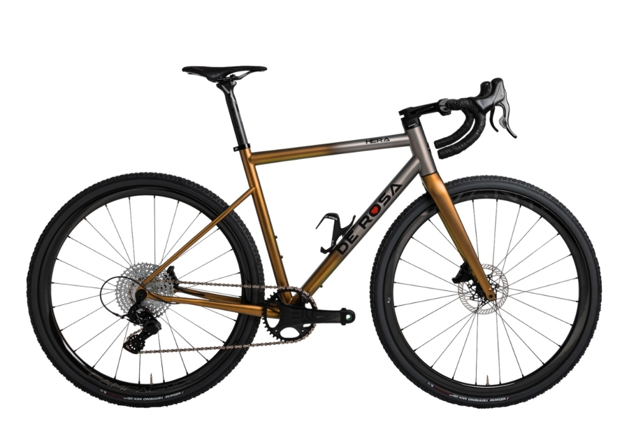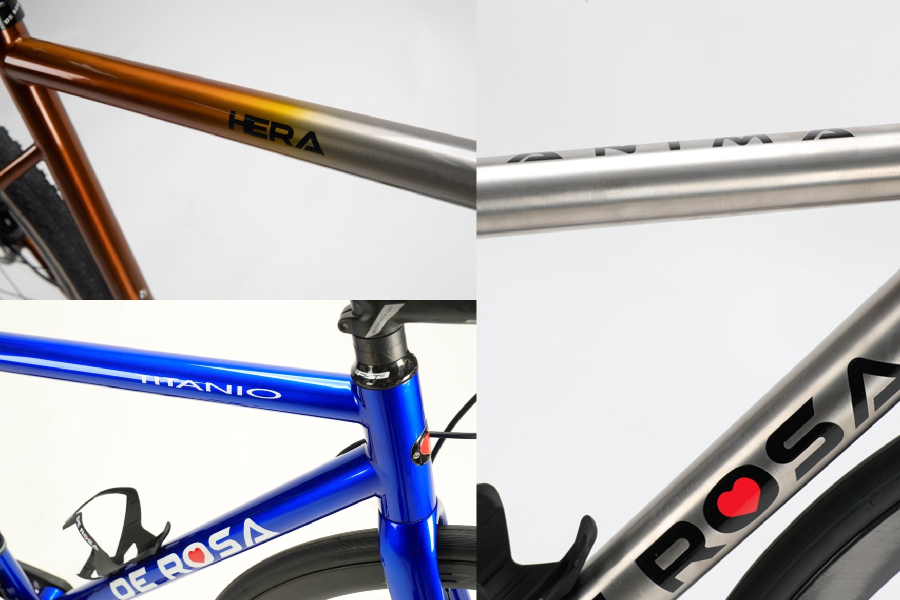 金属フレームハイエンドのANIMAは、「DE ROSAと言えばチタン」を代表するモデル。DE ROSAがつくり続けてきたチタンフレームのノウハウすべてを注ぎ込んで生み出されています。カラーリングもザ・チタン。ただならぬオーラを放っています。ケーブル類フル内装のモデルとケーブル類が外装式のモデル双方を展示しています。
